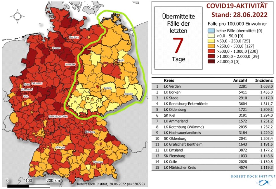 « La carte ci-dessous, issue de ce service public, fait état de l’incidence (nombre de nouveaux cas) des infections à Sars Cov-2 pour la République Fédérale d’Allemagne, sachant que la vague actuelle qui affecte le pays est le variant Omicron BA.5. »