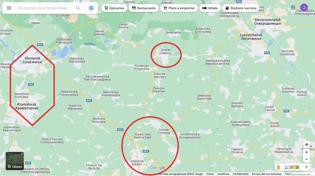 Sachant que les forces russes sont déjà aux portes de Slaviansk vers le Nord / Nord-Est et de Bakhmout vers l’Est / Sud-Est.