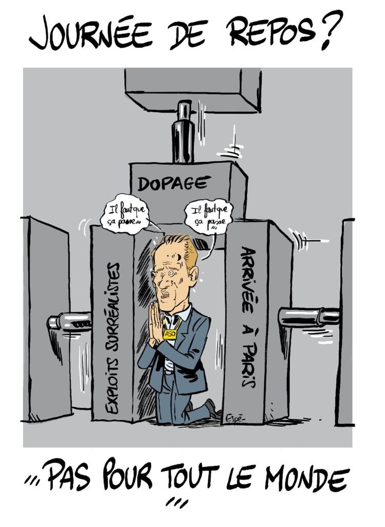 Remarquez que certains manifestants ont essayé pendant l’étape de sauver une partie de la planète en s’asseyant sur la route et en stoppant la course un court instant. Ils doivent être en garde à vue pour 24 heures. Non, mais ! Qu’est-ce qu’ils foutaient là à essayer de culpabiliser ce monde aux rouages si bien huilés ?