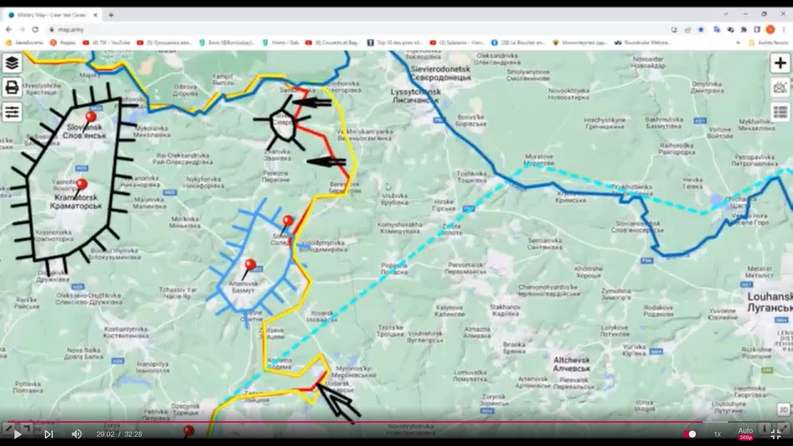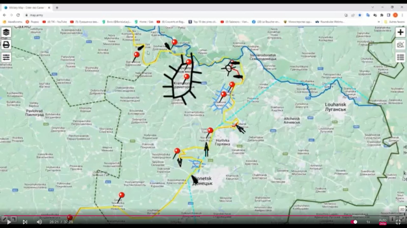 Les cinquième et sixième flèches noires montrent un nid en cours de réalisation, au Nord-Ouest de Donetsk, du côté de Piski, Lozove, Malinka