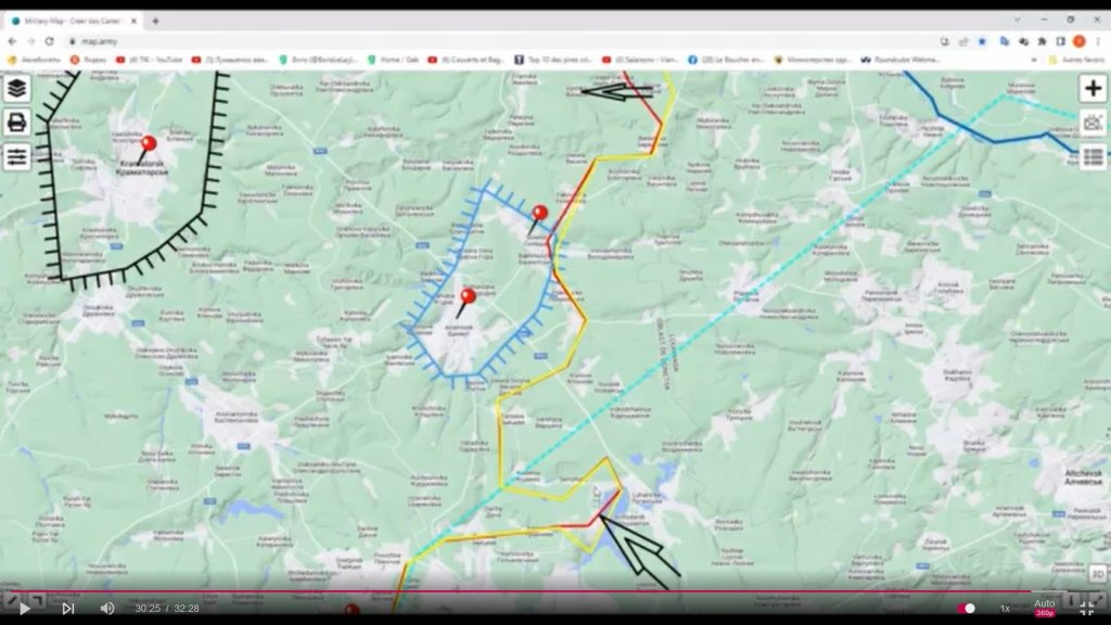 Maintenant que Severodonetsk et Lissitchansk ont été libérées, et que la poche en avant que formaient ces deux villes sur le front du Donbass a disparu, le front le plus offensif se limite à une quinzaine de kilomètres. Les Russes ont atteint Severtsk (la punaise noire en haut) et on pris le contrôle de la ville « par le feu » depuis quelques jours ; ils se trouvaient dans sa périphérie depuis, et l’on peut penser qu’actuellement cette cité est tombée. Le front sera bientôt ou est déjà sur l’axe Slovansk/Kramatorsk — Soledar/ Bakhmout/ Artemivsk (les deux punaises rouges en-dessous de la punaise noire).