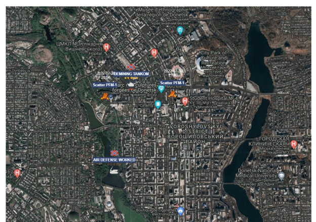 Aux environs de 21h00, le 30 juillet 2022, le cœur du centre-ville de Donetsk a été bombardé avec des roquettes de 220mm à sous-munitions dispersant des mines PFM1. Plusieurs roquettes ont été interceptées par la défense antiaérienne, mais d’autres sont parvenues à répandre des centaines de mines au milieu des quartiers résidentiels.