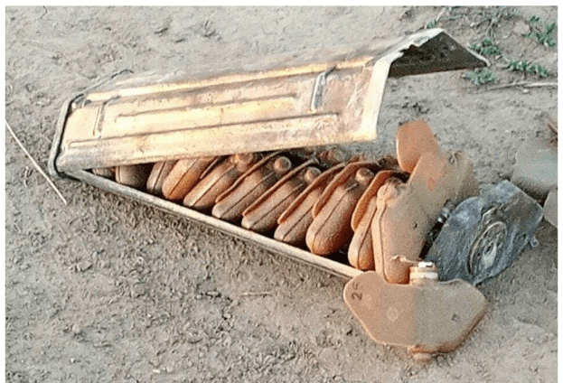 Une des « cassettes » d’une roquette abattue avec son chargement intact de mines PFM 1 « Pétale » non éjectées.