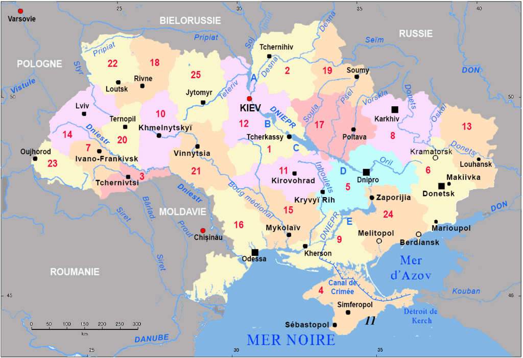 Tchernihiv est tout au Nord vers l’Est, Poltava au Sud-Ouest de Kharkov, Dnipro/Dnipropetrovsk et Zaporozhye à l’Ouest de Donetsk, Odessa tout au Sud-Ouest du pays.