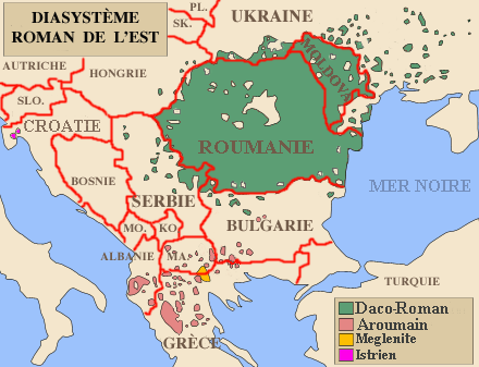 Aire d’extension des différentes langues et dialectes roumains :