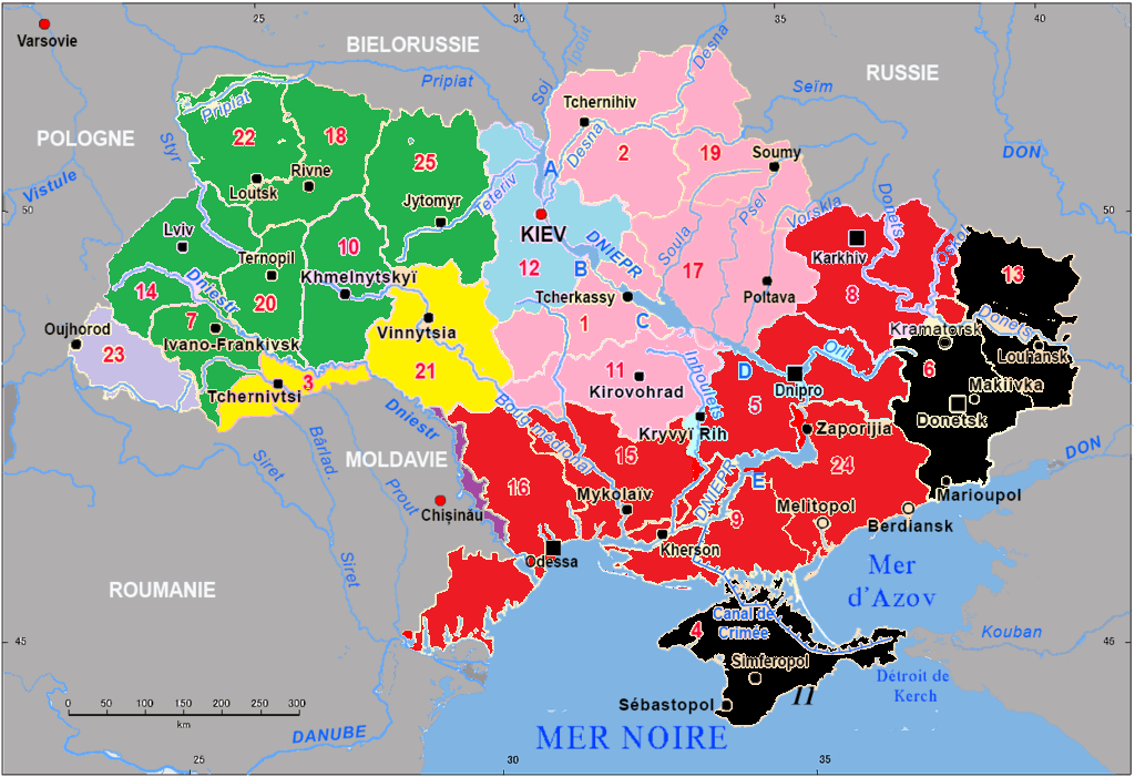 4 – à la Roumanie ; oblasti de Tchernivtsi et de Vinnytsia ; ces deux oblasti possèdent des minorités roumanophones, dont en des zones de l’autre côté de la frontière avec l’Ukraine qui étaient roumaines autrefois, avant la Seconde guerre mondiale et la main mise stalinienne sur divers territoires de la région, après que les dirigeants roumains eurent choisi le mauvais camp au côté de l’Allemagne ; le plus étonnant serait le rattachement à la Roumanie de l’oblast de Vinnytsia qu’il serait plus logique de rattacher à la Moldavie orientale, indépendante (la Moldova orientală ; la Moldova occidentală étant une région de la Roumanie).