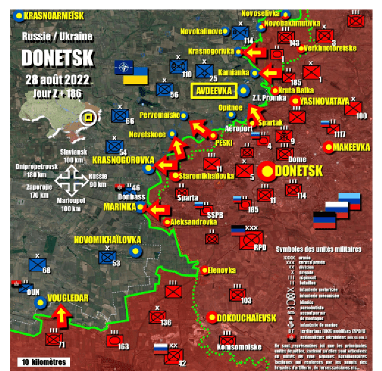 • Devant Donetsk, desserrer l’étau ukrainien en repoussant les forces de Kiev au minimum jusqu’à Krasnoarmeïsk (40 km plus à l’Ouest).