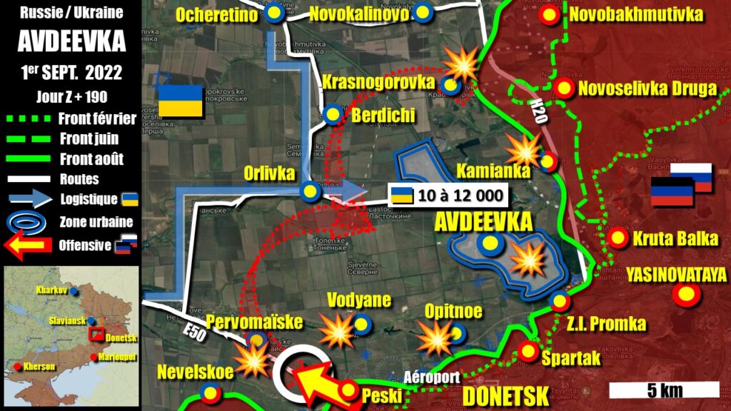“Alors que sur le front de Kherson, depuis le 29 août; les forces russes et ukrainiennes sont opposées dans de violents combats, sur le front de Donetsk des assauts non moins acharnés sont lancés par les alliés russes et républicains contre les défenses extérieures du bastion ukrainien d’Avdveeka contre lequel les bombardements de l’artillerie et de l’aviation ont redoublé d’intensité depuis 2 jours.