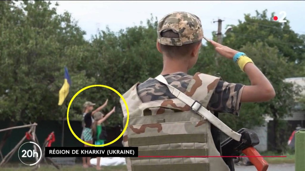 Quand on regarde la vidéo d’Aliocha on le voit secouer le bras pour saluer les soldats russes, or sur la vidéo de France 2 on ne voit aucun mouvement, c’est bien un salut nazi que font les fillettes. De plus, sur la vidéo on voit que le petit Maxime que France 2 essaye de faire passer pour l’équivalent ukrainien d’Aliocha porte des chevrons, dont un, le rouge et noir avec l’inscription « Kharkiv », est le même que celui porté par un membre du bataillon Kraken (il n’y a que les couleurs qui changent) interviewé par la chaîne ukrainienne 24 Kanal.