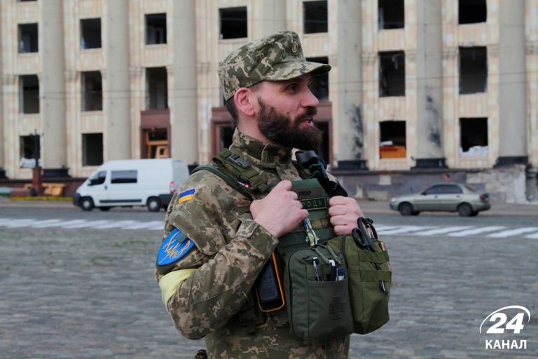Quand on regarde la vidéo d’Aliocha on le voit secouer le bras pour saluer les soldats russes, or sur la vidéo de France 2 on ne voit aucun mouvement, c’est bien un salut nazi que font les fillettes. De plus, sur la vidéo on voit que le petit Maxime que France 2 essaye de faire passer pour l’équivalent ukrainien d’Aliocha porte des chevrons, dont un, le rouge et noir avec l’inscription « Kharkiv », est le même que celui porté par un membre du bataillon Kraken (il n’y a que les couleurs qui changent) interviewé par la chaîne ukrainienne 24 Kanal.
