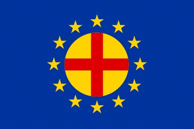 Pour en faire le drapeau dit européen, le centre rouge et or du drapeau a été supprimé, les douze étoiles d’or ont été maintenues et le bleu foncé a été remplacé par un bleu très clair substitué rapidement par un bleu marial.
