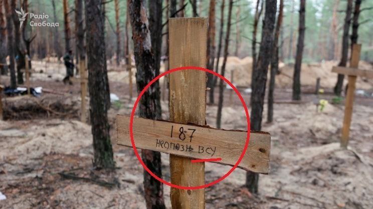 L’Ukraine peut aussi compter sur un autre facteur pour jouer la carte du massacre : ses nombreux soldats tués lors des combats pour la prise de contrôle d’Izioum, dont l’armée ukrainienne avait abandonné les corps dans sa retraite. Au lieu de laisser les corps pourrir dehors, les soldats russes les ont enterrés dignement, dans des tombes collectives ou individuelles, surmontées d’une croix portant la mention « ВСУ» (Forces Armées Ukrainiennes), comme on peut le voir sur les photos de Radio Svoboda. Sur l’une d’elle il y a même une photo avec le nom du soldat concerné.