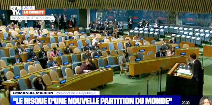MACRON AFFREUSEMENT HUMILIÉ Â L’ONU: 3/4 DES PAYS ABSENTS POUR SON DISCOURS ! Chaque année,la rentrée de septembre de l’AG de l’ONU voit les chefs d’État (ou MAE) des 193 États membres venir y faire un discours. Les dirigeants les plus puissants ou écoutés y font salle comble.