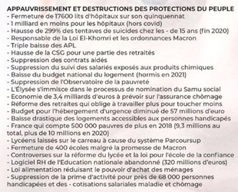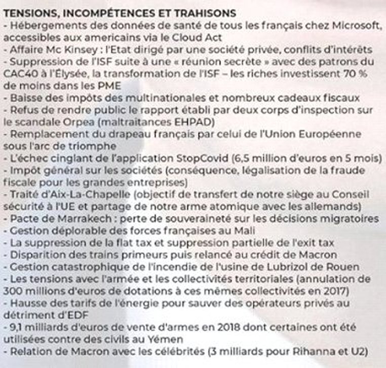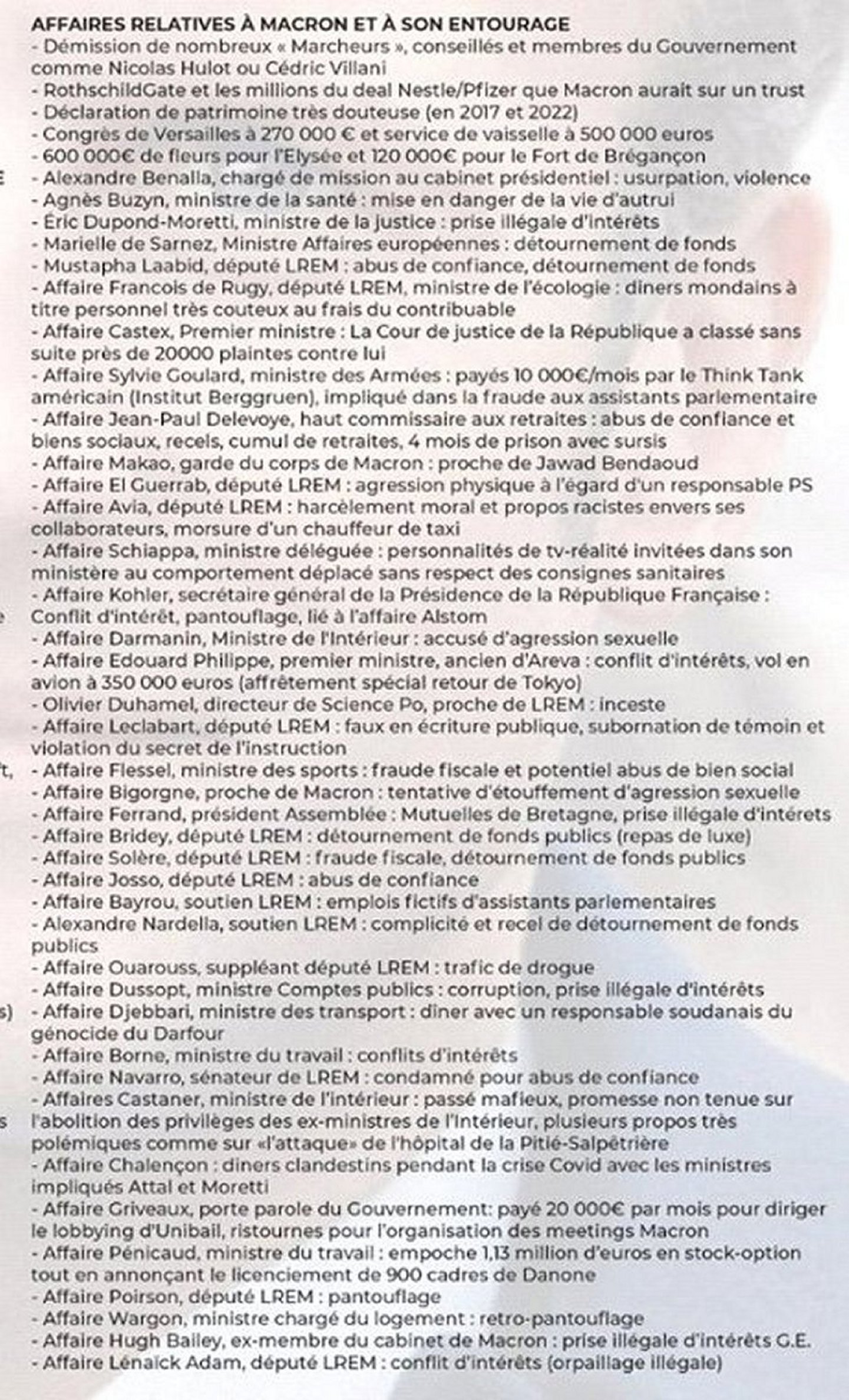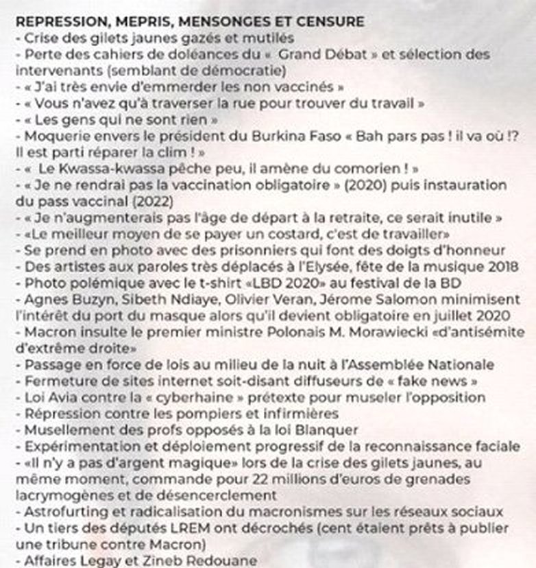 Voici une liste de « griefs » à l’encontre de macron et de la macronie. Liste bien évidemment incomplète. Par exemple, je n’ai pas noté la présence de ses réparties concernant les alcooliques du Nord et les demeurées du Morbihan (ce n’était pas dit tout à fait comme, mais c’est ce que ça voulait dire). Par exemple, ses propos désobligeants sur les Français dans ses voyages à l’étranger.