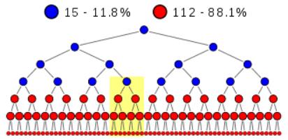 Dans cet exemple une minorité, les 15 premiers déposants (en bleu, appelons-les les « démocrates »), tirent profit de l’argent des 112 déposants suivants (en rouge, appelons-les les « républicains ») qui eux ne peuvent y gagner qu’à la condition que 384 déposants les rémunèrent, etc. C’est sans fin ; et un jour ou l’autre, c’est la ruine pour la banque et ses déposants. Le pire est que ce système se développe sous une forme exponentielle.