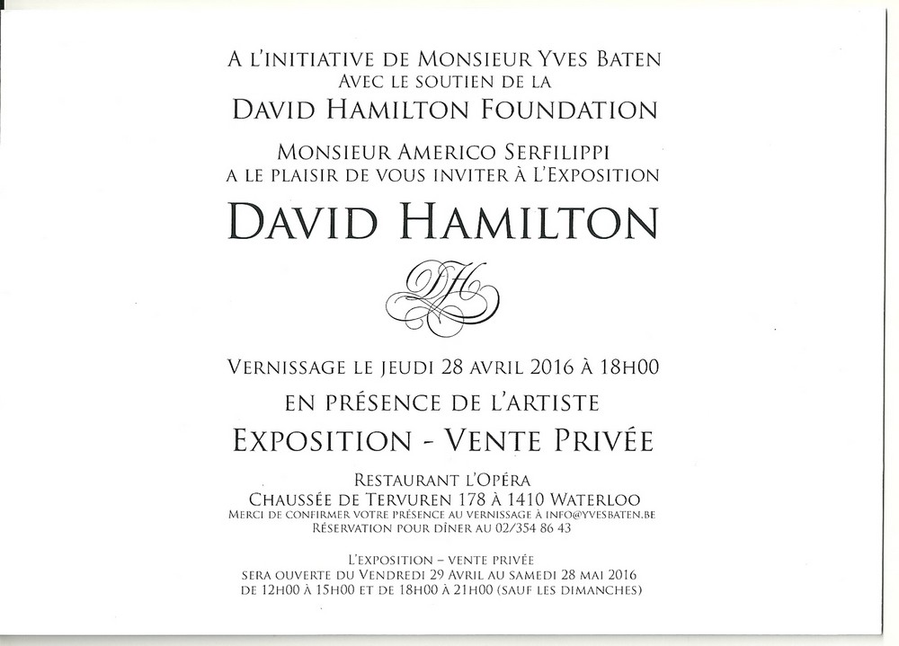 Carton d’invitation à la dernière exposition de David Hamilton du printemps 2016 à Waterloo, lieu prédestiné.