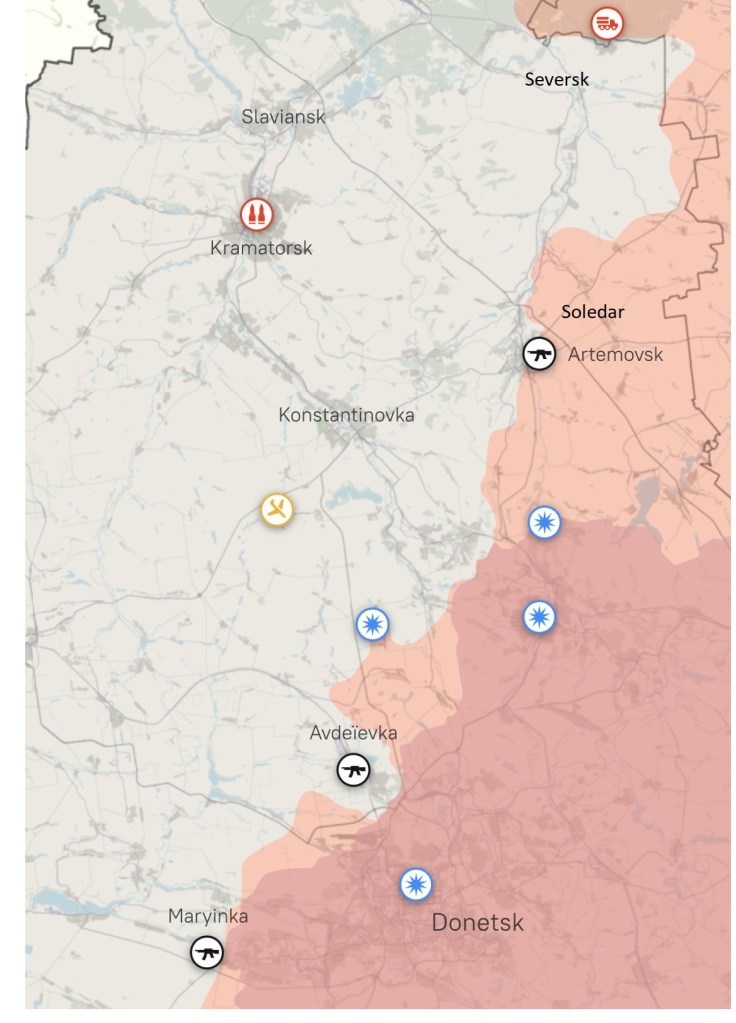 Quand le problème Artemovsk/Soledar sera définitivement réglé, en grande partie grâce aux bataillons Wagner (également très présents en première ligne à Maryinka et Avdeïevka) l’armée ukrainienne, du moins une bonne partie de cette armée, qui ici reçoit sans arrêt des renforts qui se font éliminer en grand tous les jours, devrait se replier sur Seversk et Slaviansk / Kramatorsk. Peut- être Konstantinovska.