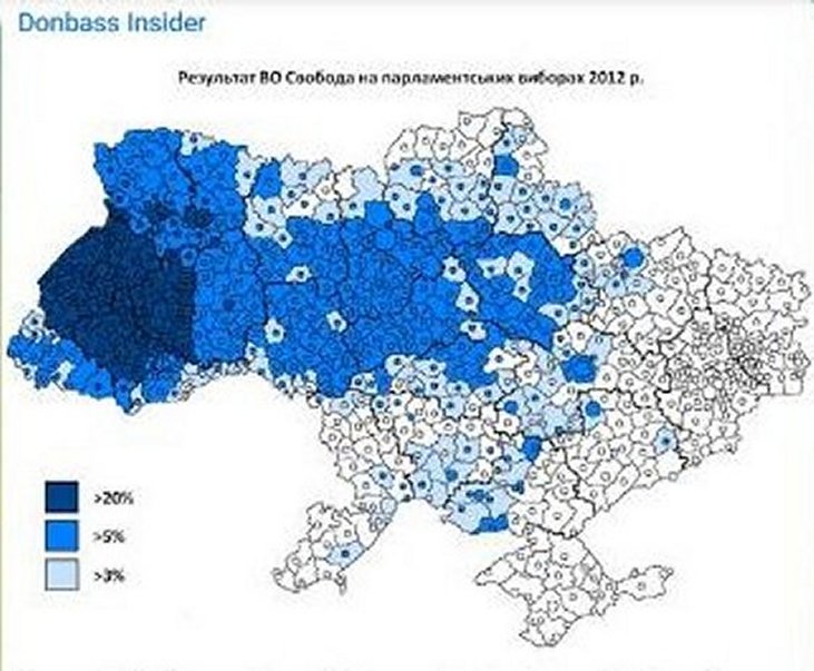 Une carte intéressante, voici le score le plus important jamais réalisé du Parti Svoboda, avec au niveau national plus de 10 % des voix, raflant 12 sièges et 25 autres par alliances avec d’autres formations d’extrême-droite, nous sommes fin 2012, dans un contexte où les USA préparaient déjà le Maïdan, on perçoit très bien où se trouve le nid bandériste en Ukraine… et où l’influence était quasi nulle… en Crimée, dans les oblasts de Zaporojie, Donetsk, Lougansk, dans les zones proches d’Odessa et de la Transnistrie, mais l’on voit aussi la contamination du Centre du pays, avec Kiev notamment et déjà un clignotant à Dniepropetrovsk, la future base d’attaque des Ukrainiens vers le Donbass. [(jpf) On pourrait ajouter : ce qui semble être aussi le cas à Kharkov et à Soumy, tout au Nord-Est, et quelques autres villes du Sud, ce qui en fait là la marque d’un phénomène urbain et de brassage de populations.
