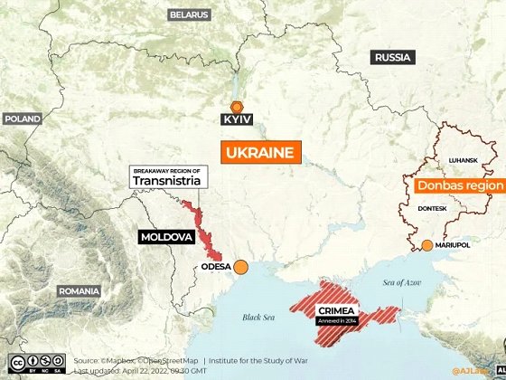 [(jpf) Le long du Nistru en roumain, du Dniestr en russe, du Dnister en ukrainien et du … Danaster/-tri ou Danaster/-rus/-ri ou Danasteris en latin ; toute petite entité d’un peu plus de 4000 km2, capitale Tiraspol, qui a l’avantage si l’on peut dire de jouxter l’oblast largement russophone d’Odessa. Et de posséder sur son territoire un très important arsenal, dépôt d’armes à Colbasna, au Nord de ce territoire, de l’époque soviétique, à moins qu’il n’ait déjà été rapatrié, du moins en partie en Russie]