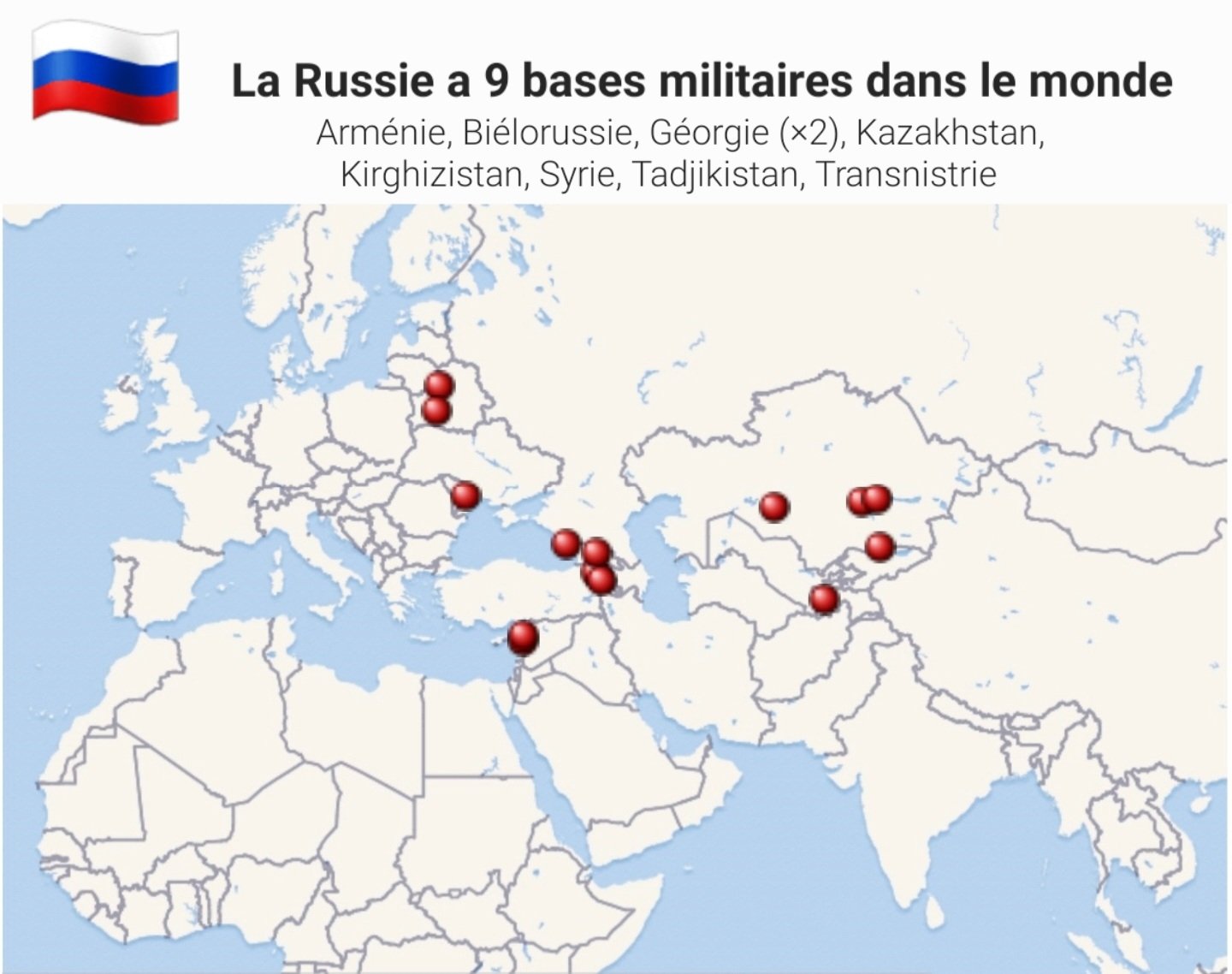 Pour ce qui est des bases militaires, voici la carte des bases russes hors de Russie :