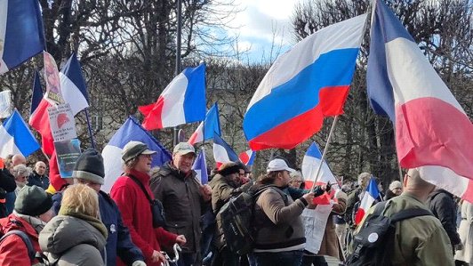 Des drapeaux russes ont été brandis lors de la #MarcheNationalePourLaPaix organisée par le groupuscule [sic]complotiste [resic] de Florian #Philippot.