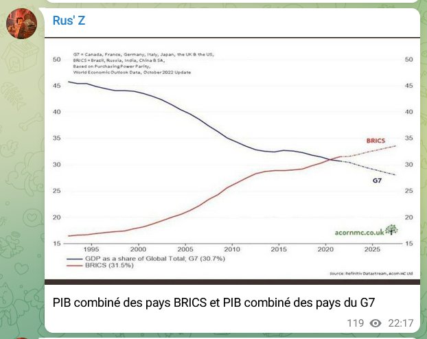 Une nouvelle intéressante est apparue aujourd’hui: le PIB [produit intérieur brut] combiné des pays BRICS a dépassé le PIB combiné des pays du G7. Le calcul a été effectué à parité de pouvoir d’achat. De plus, si vous regardez le graphique, vous pouvez voir la chute progressive du G7 et la montée progressive des BRICS. Que peut-on dire à ce sujet.
