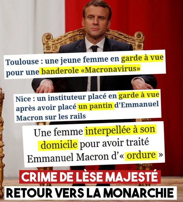 Et ceci depuis qu’une femme a reçu chez elle la visite de trois flics qui ont jugé bon de l’emmener au commissariat et de la maintenir en garde à vue, et de la faire inculper pour l’incommensurable délit d’avoir mis sur Face de Bouc : «L’ordure va vous parler demain à 13 heures». Sous Macron, le crime de lèse majesté est rétabli.