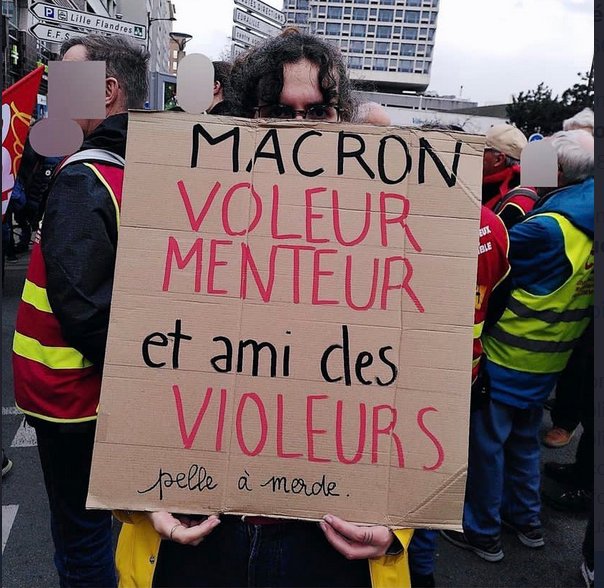 Oui, parce que « Macron Ordure » est un gros mot. Il ne faut pas employer « Macron Ordure ». C’est mal ! Par contre « Macron Taré », je ne sais pas si c’est déconseillé, ou « Macron Éborgneur ». Ou « Macron Facho ». Ou « Macron Branleur », « Macron Kéké », « Macron Coca », « Macron Macro », « Macron Tocard », Madure Orcron »…