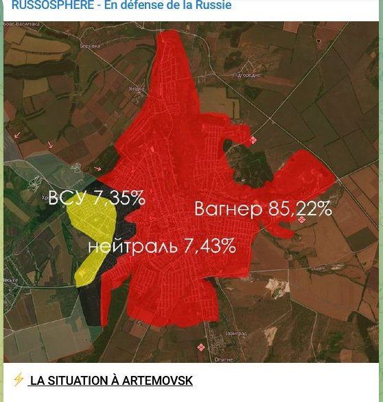 La carte nous montre que plus de 80% du territoire urbain est entre les mains russes (Вагнер = Wagner). Et que la présence ukrainienne (BCY = Forces Armées Ukrainiennes) y devient presque résiduelle. La zone Нейтраль, neïtral’, est la zone neutre ou zone grise.