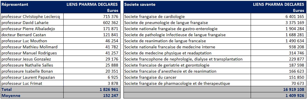 La base de données https://transparence.sante.gouv.fr, consultée via le site eurosfordocs.fr, comptabilise le montant des avantages perçus de l’industrie pharmaceutique. Les sommes comptabilisées le sont pour les sociétés savantes signataires de ladite tribune, mais également pour leurs représentants à titre individuel au cours des 4 dernières années. Les montants rapportés ne comptabilisent pas les conventions où les montants ne sont pas déclarés.