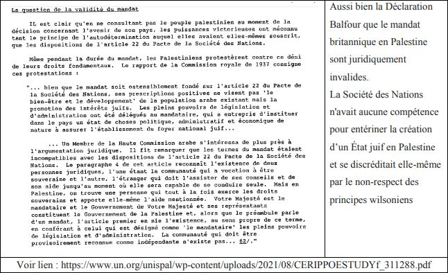L’omission volontaire des promesses de création d’un Royaume6 arabe et le non-respect de la Charte de la Société des Nations (Article 22), nouvellement créée pour assurer entre autres et selon les principes wilsoniens, le droit des peuples à disposer d’eux-mêmes.