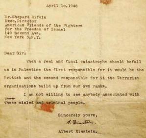 Dans une autre lettre, cosignée avec d’autres coreligionnaires (27 personnalités dont Hannah Arendt), adressée au journal New York Times, Albert Einstein8 dénonce les méthodes nazies du parti sioniste «Tnuat Haherut» sous Menahem Begin (futur Premier ministre) avec le texte ci-après :