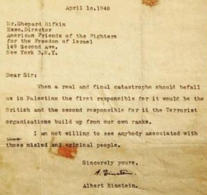 Dans une autre lettre, cosignée avec d’autres coreligionnaires (27 personnalités dont Hannah Arendt), adressée au journal New York Times, Albert Einstein8 dénonce les méthodes nazies du parti sioniste «Tnuat Haherut» sous Menahem Begin (futur Premier ministre) avec le texte ci-après :