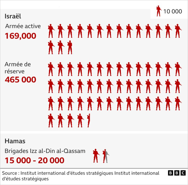 Les USA sont le principal fournisseur en armements et parrain de l’entité sioniste. Porte-avions et autres navires de guerre sont sur place. Il n’est nullement question d’un conflit asymétrique, mais d’un conflit entre deux États, Israël, État juif et démocratique (notons l’oxymore !) et l’autre, fanatique-religieux (le Hamas), deux États qui «s’équivalent» militairement en raison de l’appui supposé ou réel du second par les «forces du mal» (Iran, Hezbollah…). Le rapport de force nous est illustré dans le tableau ci-dessous. Passons outre sur le très haut niveau technologique de l’armée de terre, de l’air et de la marine sionistes qui existe depuis plus de 50 ans.