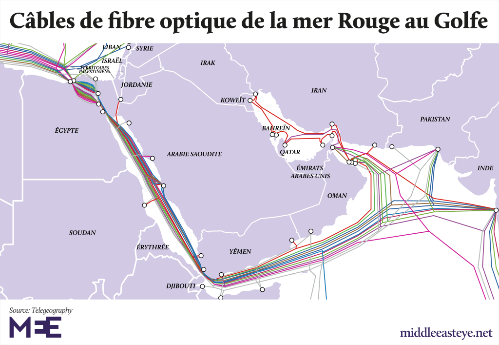 L’existence d’un réseau de câbles de fibres optiques sous-marins (Internet, espionnage…) reliant les pays asiatiques, africains et européens et passant justement par Bab el Mandeb (en Mer rouge où la profondeur des eaux ne dépasse pas les 200 mètres), amplifie la complexité de la situation et les risques de dérapages voire de déstabilisation de toute la région si le génocide des Palestiniens continue. Ce qui porterait un coup sérieux aux BRICS, un objectif convoité et à atteindre pour les États-Unis.