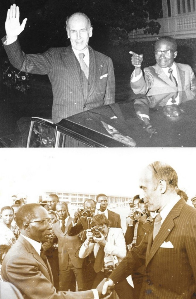 Au sommet franco-africain, tenu à Dakar en avril 1977, l’accueil de Giscard d’Estaing par Leopold Sedar Senghor, photo de presse.