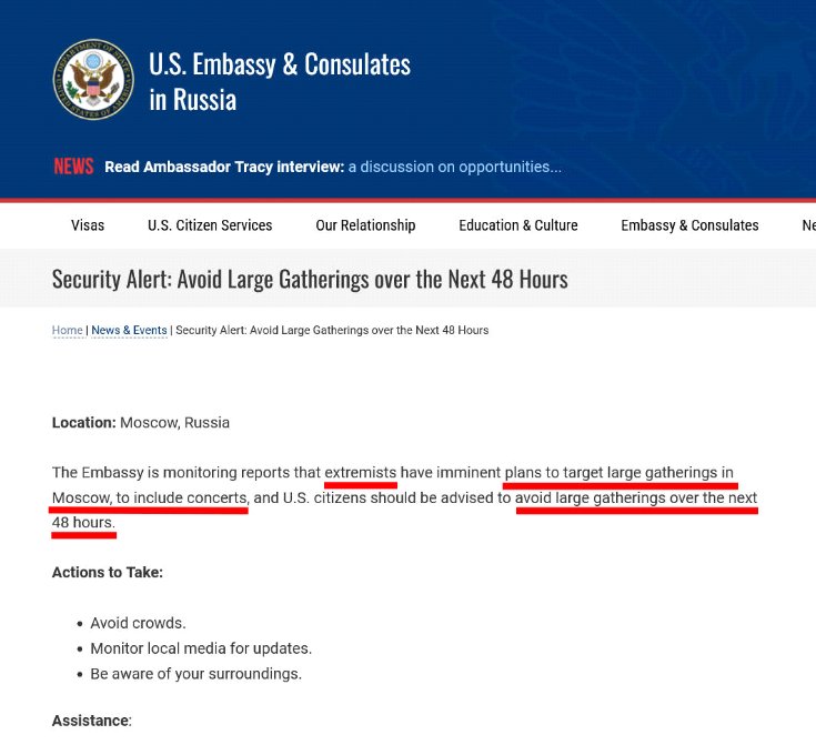 Le 7 mars 2024, l’ambassade américaine (voir capture d’écran ci-dessous) et l’ambassade britannique en Russie ont alerté leurs ressortissants d’un risque d’attaque à Moscou dans les 48 heures.