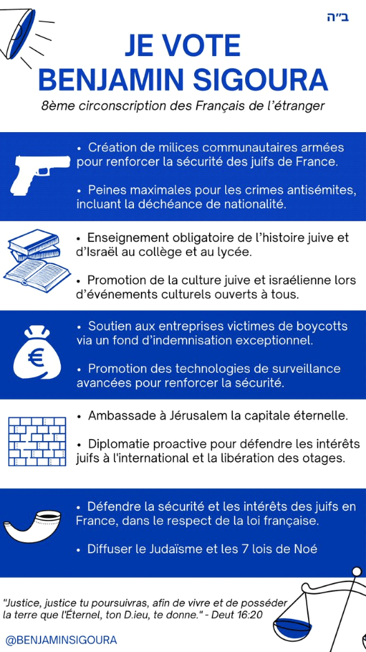On connaissait déjà le raciste Meyer Habib, mais on tient là du « meilleur » encore avec un certain Benjamin Sigoura candidat aux élections législatives « françaises » de la huitième circonscription des Français de l’étranger (du côté de Sion entre autres). Voici son programme (sans rire) !!!