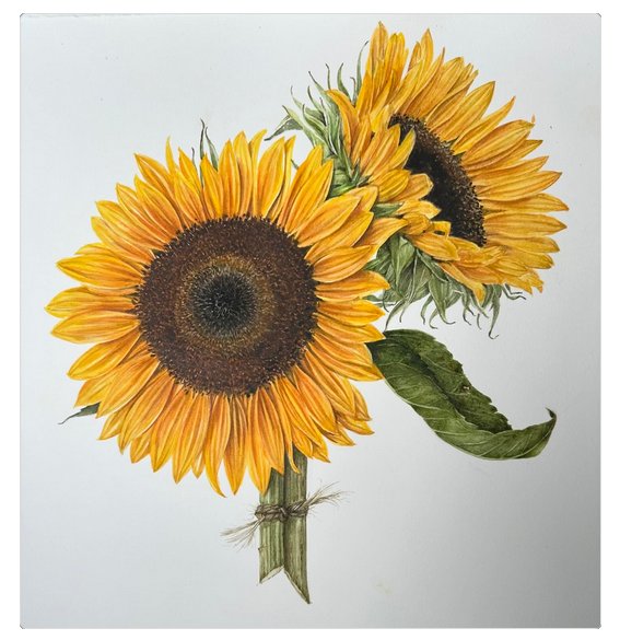 Deux yeux énormes et une langue tirée ? … Non, voici deux têtes de tournesol liées entre elles par des brins d’herbe quelconque torsadées. Têtes coupées et n’ayant plus les pieds sur terre. Ou plus exactement alors que seuls leurs racines et leurs tiges ont peut-être encore les pieds sur terre. Ou pourraient peut-être repartir sur pied, mais sans doute plus de concert.