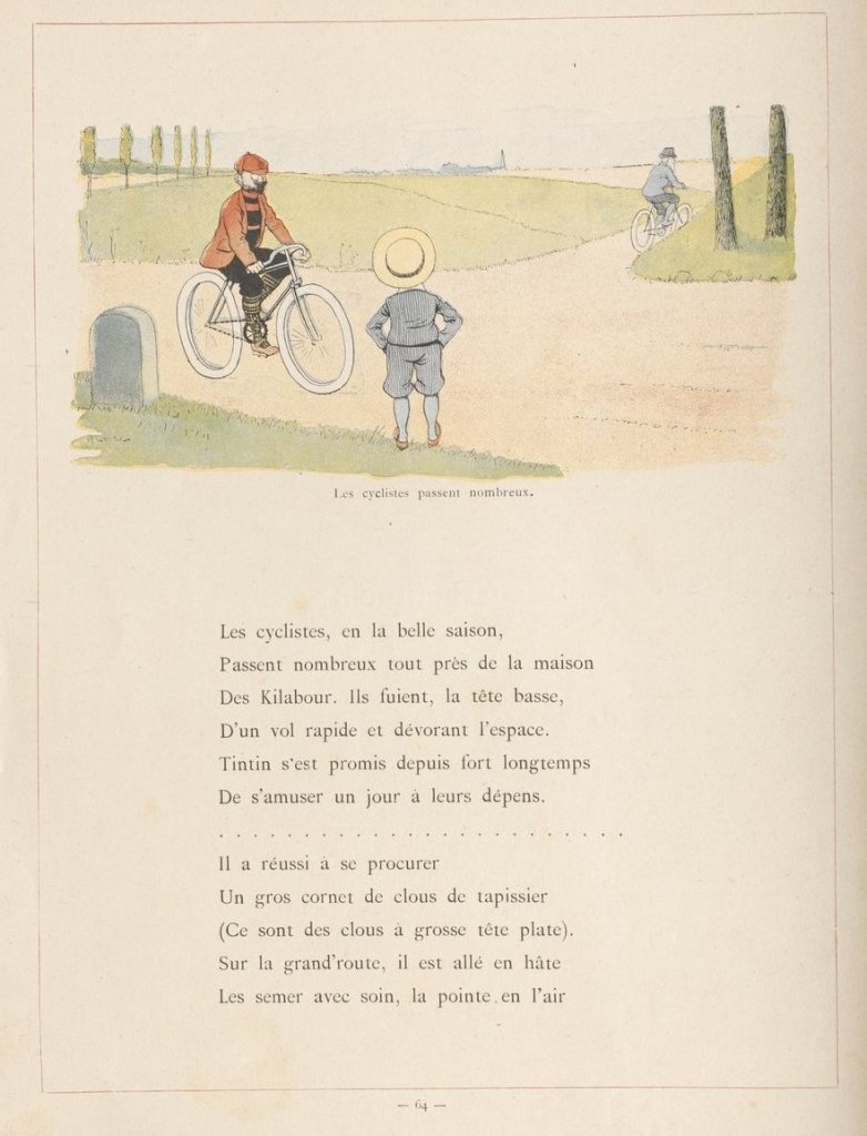 Et dans mon étude sur Tintinel, j’évoque entre autres petits personnages des bandes dessinées anciennes, Tintin-Lutin pré-publié en 1897 dans Le Rire et dont l’album a été publié en 1898. Petit chenapan (il lui arrive de semer des clous sur les routes, destinées aux roues des vélocipèdes) créé par l’illustrateur Benjamin Rabier (1864 – 1939) et « mis en paroles », en vers (des décasyllabes pas toujours très réguliers) par Fred Isly, pseudonyme de Fernand Amson (1863 – 1920), dramaturge qui fut aussi romancier, et également directeur du « journal humoristique hebdomadaire » Le Pêle-mêle (journal qui, quant à lui, vécut de 1895 à 1930). Il a collaboré à plusieurs albums de Rabier. Ce Tintin-ci a pour prénom complet Martin.