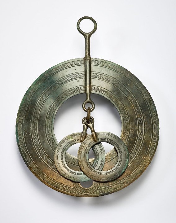 « Formé d’un disque principal raccordé à deux petits disques par une tige latérale et des anneaux, cet ornement était vraisemblablement apposé sur le poitrail d’un cheval. Ainsi suspendus autour de son cou, les disques s’entrechoquaient à chacun de ses pas. L’usage de cet objet était réservé à une classe sociale élevée, soucieuse de marquer son passage de manière visuelle et sonore. » (musee-lorrain.nancy.fr/les-collections/les-oeuvres-majeures/)