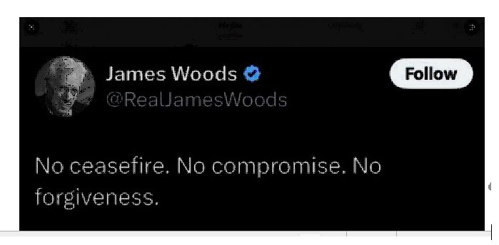 Le pauvre James Woods, un « acteur » étatsunien, aujourd’hui retraité, et hystériquement sioniste, qui fut autrefois connu pour avoir joué le rôle principal dans la mini-série Holocauste (1978), bien évidemment celui de l’hyper-gentil Juif allemand, pas de l’hyper-méchant Boche nazi, a vu son vœu exhaussé :