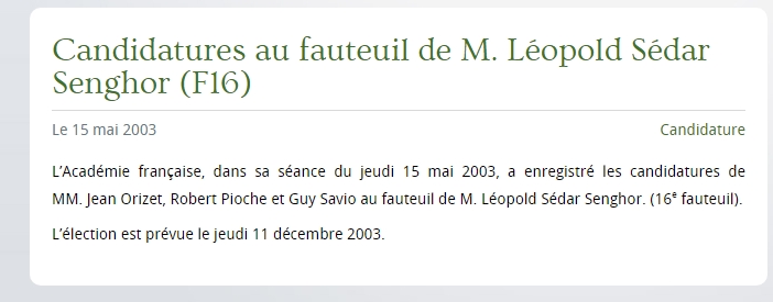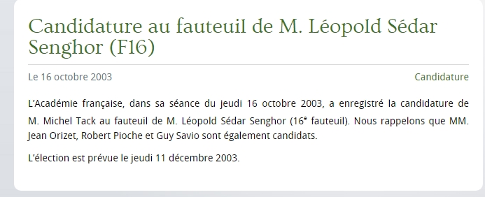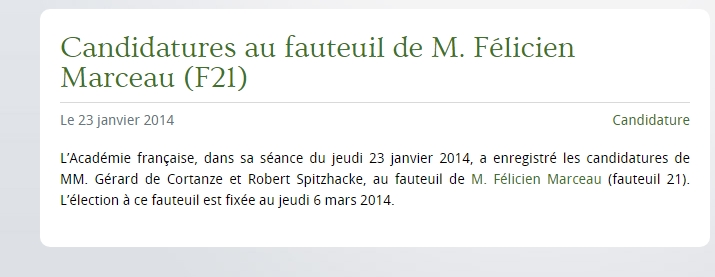 2003. Annonce réitérée, sur le site officiel de l’Académie, de la candidature d’Olivier Mathieu alias Robert Pioche.