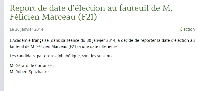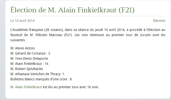2014. Annonce de la candidature de « Robert Spitzhacke » (le mot signifie « pioche », en allemand) lors de l’élection encore plus difficile (16 voix sur 28 votants) d’Alain Finkielkraut. Avec huit bulletins marqués d’une croix (hostilité absolue). « Le Figaro », par la plume d’un brillant spécialiste de l’Académie, jugea inimaginable que Robert Spitzhacke puisse être élu face à Alain Finkielkraut. Certes.