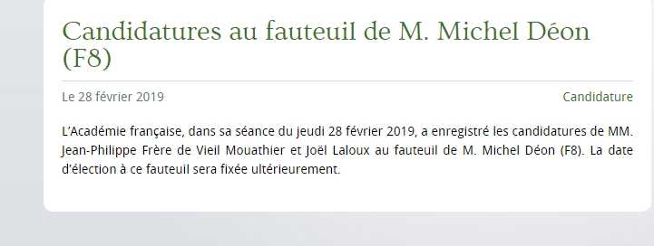 2019. Candidature (7 février 2019) d’Olivier Mathieu au fauteuil de Michel Déon. Olivier Mathieu, lors de cette élection, fut opposé à son propre frère jumeau, Jean-Philippe Mathieu, né le 14 octobre 1960, dont la candidature date du 28 février 2019. Jean-Philippe Frère de Vieil Mouathier, phonétiquement « Vieille Moitié », « Vieil Mouathier » étant en outre l’anagramme parfaite d’Olivier Mathieu. Jean-Philippe Mathieu est mort le 19 octobre 1960. Lors de cette élection, donc, il s’est présenté à l’Académie 59 ans après sa naissance. Et deux frères jumeaux, l’un vivant et l’autre mort, se sont disputé l’immortalité.