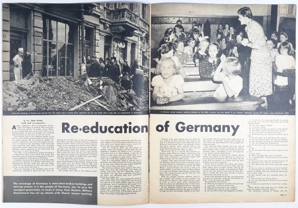 L’auteur explique – dans le magazine officiel de l’armée américaine – que la première ville allemande capturée par les Américains sous « la guerre des bombes » (les bombes anglo-américaines) devenait le laboratoire d’une nouvelle pédagogie destinée à enseigner à ces enfants (s’ils ne les avaient pas déjà compris, sortant de « caves et de rues détruites ») les « concepts démocratiques du bien et du mal ».