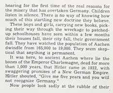 « Aujourd’hui, les gens entendent pour la première fois les véritables raisons de la misère qui s’est emparée de l’Allemagne. Les enfants écoutent en silence. Il n’y a aucun moyen de savoir dans quelle mesure ils croient à cette nouvelle doctrine surprenante. Ces garçons et ces filles, portant de nouveaux livres, choisissent de se frayer un chemin à travers les décombres, jusqu’à leurs écoles, après avoir vu en quelques mois leurs maisons, leurs villes et leur gouvernement tomber en ruines. Ils ont vu passer la population d’Aix-la-Chapelle de 165 000 à 19 000 habitants. Ils semblent accepter que tout est éphémère. C’est ici, dans l’ancienne Aix-la-Chapelle, là où se trouvent les ossements de l’empereur Charlemagne, mort il y a plus plus de 1 000 ans, que Hitler est venu en 1932, avec des promesses fanfaronnes au sujet d’un nouvel empire allemand.
