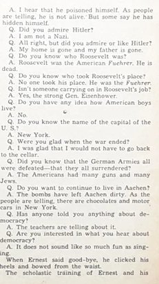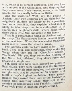 « Maintenant les gens considèrent avec tristesse les ruines de leur ville, qui est détruite à 85 %, et regardent avec respect les canons alliés. Et ils disent que jamais ils n’ont jamais été nazis, et qu’ils ne croyaient pas vraiment en Hitler. Et les enfants ? Eh bien, disent les gens d’Aix-la-Chapelle, leurs propres enfants étaient des enfants bien, mais les enfants du voisin étaient susceptibles d’être un problème. Vous savez comment c’est, expliquent-ils, une mauvaise idée est susceptible de s’enraciner profondément chez l’enfant, c’est-à-dire chez l’enfant d’un voisin, quand il y avait une influence dans sa maison. C’est une chose remarquable à Aix-la-Chapelle et en Allemagne. Les nazis vivent toujours dans la maison d’à côté, ou dans la ville voisine. À la fin de la guerre, 90 000 000 nazis avaient changé de rue. Les enfants allemands sourient et, parfois, ils font le V de la victoire lorsqu’ils demandent « Chocolat, Oncle». Les nazis ? Oh, oui, ils se souviennent d’avoir entendu parler des nazis, mais ils ne se souviennent pas d’en avoir connu un seul. Pourtant, les garçons plus âgés ont été imprégnés pendant des années de rituels nazis. On leur a enseigné que les Allemands étaient supérieurs à tous les autres peuples ; que la guerre était bonne et glorieuse ; que devenir un SS était la plus grande ambition d’un garçon. Ils y ont cru; ils ont rugi leur amour du Führer en chantant des chants de marche nazis rauques ; ils ont craché sur les démocraties et sur Franklin Roosevelt. Ils étaient fiers d’inciter les gens ».