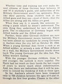 Il n’y a presque pas eu de vandalisme de la part de jeunes Allemands à Aix-la-Chapelle depuis la chute de la ville le 20 octobre 1944. Quand un jeune Allemand lance une pierre sur un soldat allié, ou trace un slogan sur un mur, le gouvernement militaire sévit durement. Les jeunes Allemands l’ont compris rapidement, les Alliés ne plaisantent pas. Avec les plus jeunes enfants allemands, de 11 ans et plus jeunes encore, les perspectives sont plus optimistes. Les nazis avaient trop de choses à faire, pendant ces deux dernières années, pour s’inquiéter beaucoup de l’endoctrinement. Et donc, il y a des indications qu’il sera possible de remodeler la pensée des enfants, à ces âges. Jusqu’à présent, les écoles d’Aix-la-Chapelle ont été rouvertes à seulement 750 enfants âgés de 6 à 10 ans, concernant les quatre premiers niveaux scolaires ».