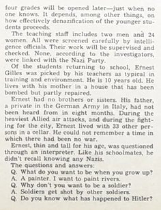 L’équipe pédagogique est composée de deux hommes et de 24 femmes. Tous ont été soigneusement sélectionnés par des fonctionnaires de l’Intelligence. Leurs travaux seront encadrés et vérifiés. Aucun de ces enseignants, selon les enquêteurs, n’était lié au parti nazi. Parmi les élèves qui retournent sur les bancs de l’école, Ernest Gilles a été choisi par ses professeurs comme typique quant à sa formation et son environnement. Il a 10 ans. Il vit avec sa mère dans une maison qui a été bombardée, mais partiellement réparée. Ernest n’avait ni frères ni sœurs. Son père, un simple soldat de l’armée allemande en Italie, n’a pas donné de ses nouvelles depuis huit mois. Au cours des attaques aériennes alliées les plus intenses, et pendant les combats, Ernest vivait avec 33 autres personnes dans une cave. Il ne se souvient pas d’une époque de sa vie où il n’y ait pas eu de guerre. Ernest, mince et grand pour son âge, a été interrogé par l’intermédiaire d’un interprète. Comme ses camarades de classe, il ne se souvient pas avoir connu de nazis. »